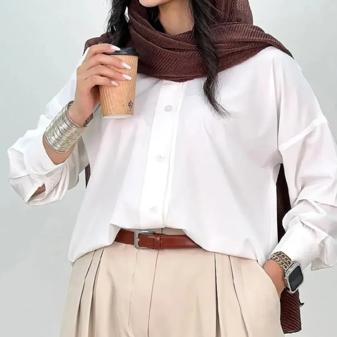 این شومیز ساده و جذاب مناسب برای استایل شیک است. قد کار ۷۳ سانتیمتر، قد آستین ۶۶ سانتیمتر، عرض سینه ۵۰ سانتیمتر و دور سینه ۱۱۰ سانتیمتر. جنس بیسیک و آبرفت ندارد.فری سایز تا۴۴